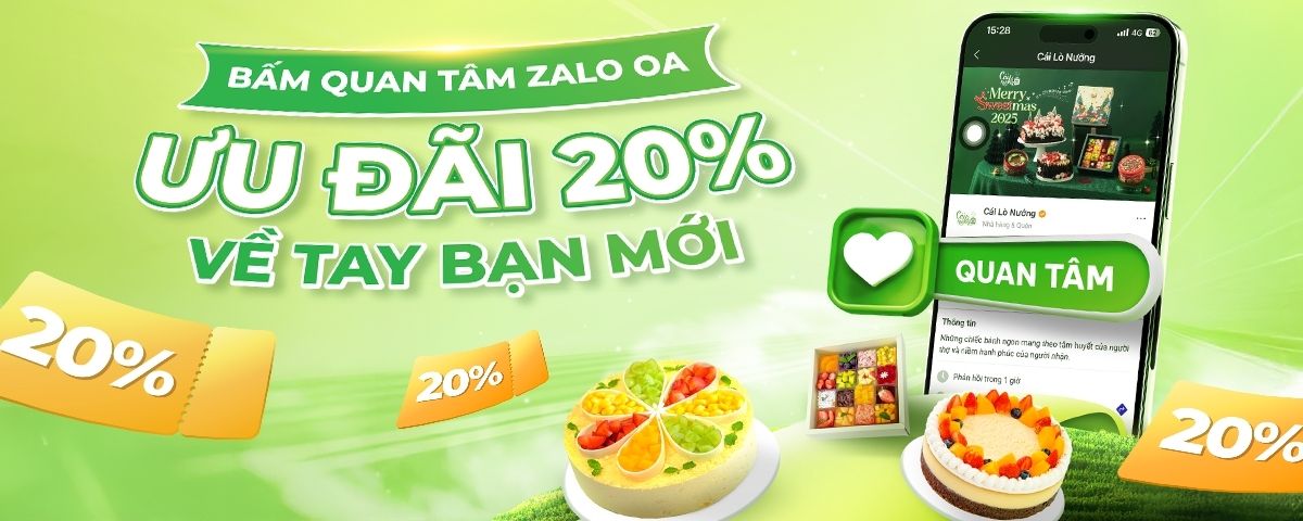 Từ ngày 02/12/2025 đến 15/01/2026, khi khách hàng ấn nút “Quan tâm” Zalo OA Cái Lò Nướng sẽ nhận được Mã Giảm Giá 20%.