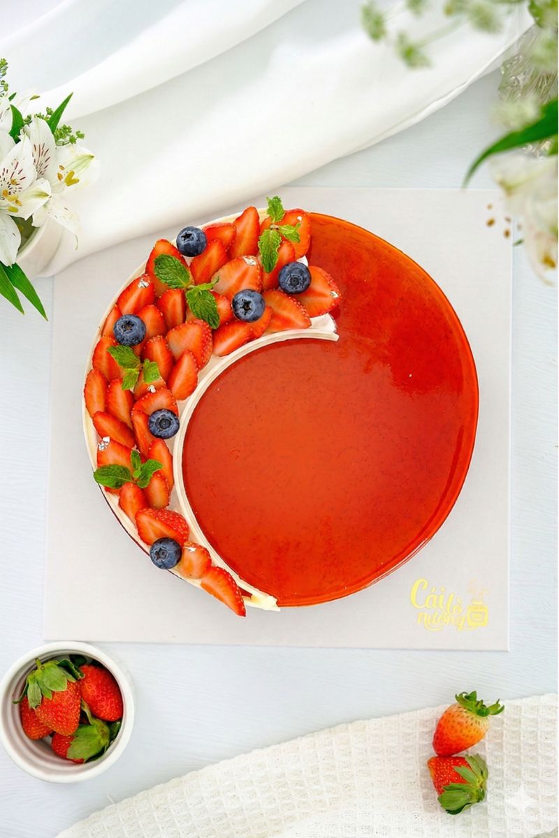 Phần trang trí: jelly caramel, dâu tươi, việt quất