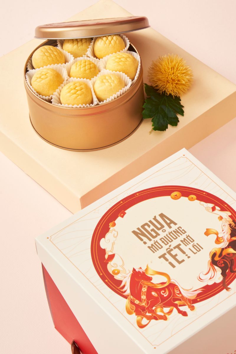 - Hộp LỘC VÀNG: Bên trong là Bánh Dứa Vỏ Cam Tròn Đầy với lớp vỏ thơm bơ ôm lấy nhân dứa sên dẻo ngọt. Hình dáng tròn trịa tượng trưng cho sự sung túc, trọn vẹn cả năm.