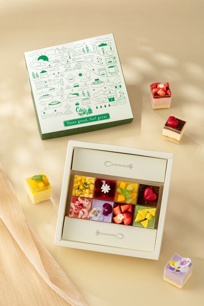 - Set 8 bánh: Bơ, Bắp, Ổi Hồng, Vải Hoa Hồng, Mận Hà Nội, Khoai Tím, Cóc Vàng, Tiramisu.